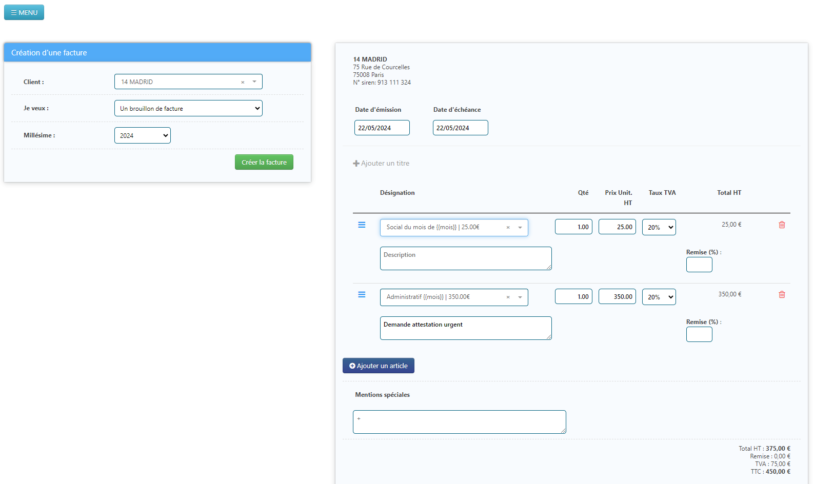 Des factures unitaires permettent de générer des brouillons de facture a valider ou bien des factures finalisees selon des modeles personnalisables et selon une bibliotheque propre de prix/produits.